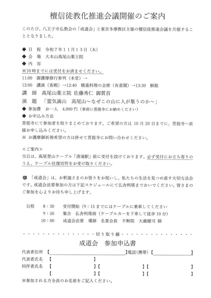 来る11月13日(木)、大本山高尾山薬王院にて、八王子仏教会「成道会」と圓乘院の所属する東京多摩教区共催による檀信徒推進会議を執り行います。