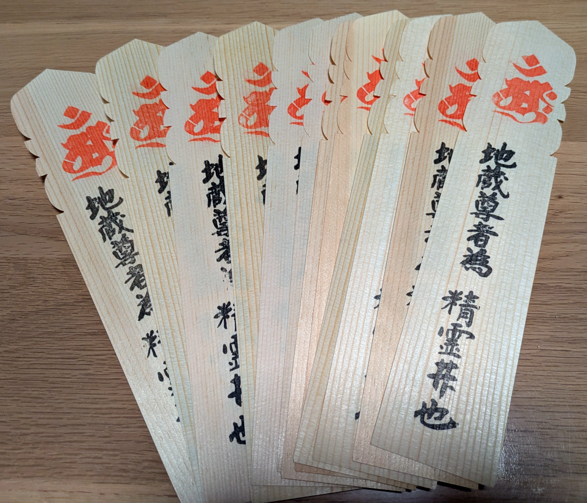 また、地蔵尊所有者様用の経木塔婆につきましては、昨年までは大施餓鬼会の卒塔婆と一緒にお渡ししておりましたが、本年より本堂前に経木塔婆置き場を設けております。必要分をそちらからお持ちいただき、各自でお参りくださいますようお願い申し上げます。